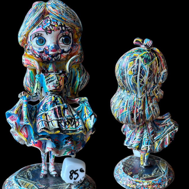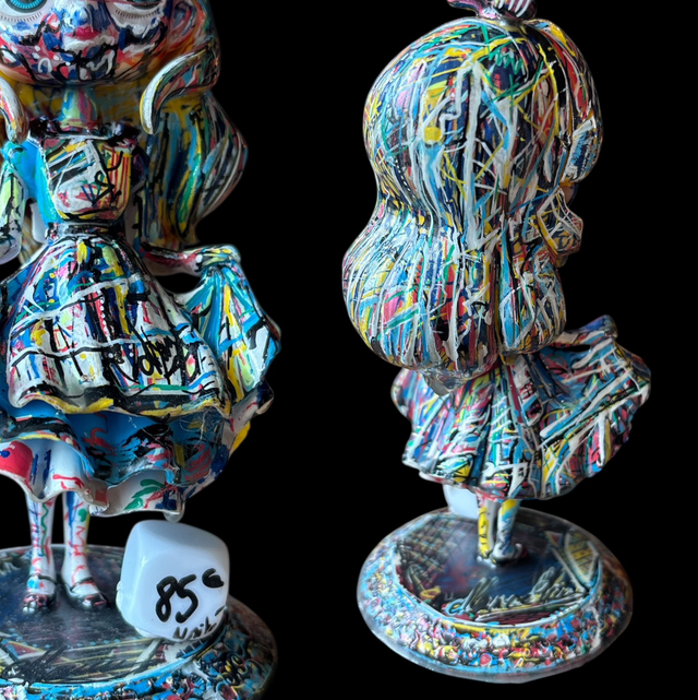 Figurine d’origine recyclée dans mon style pop art abstrait. De nombreuses heures de travail à chiner puis peintre au stylo acrylique et pour enfin terminer à la résine époxy. Chaque œuvre est unique, signée à différents endroits et avec son certificat sur demande.
