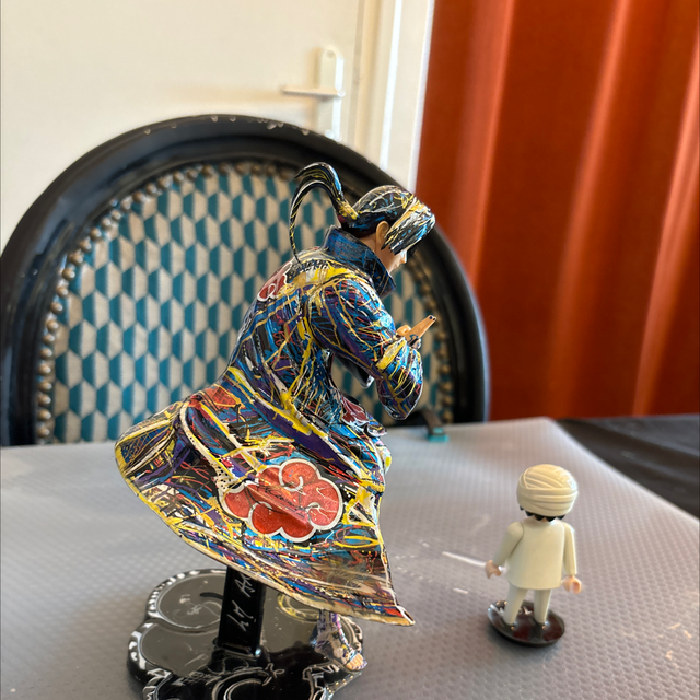Figurine d’origine recyclée dans mon style pop art abstrait. De nombreuses heures de travail à chiner puis peintre au stylo acrylique et pour enfin terminer à la résine époxy. Chaque œuvre est unique, signée à différents endroits et avec son certificat sur demande.